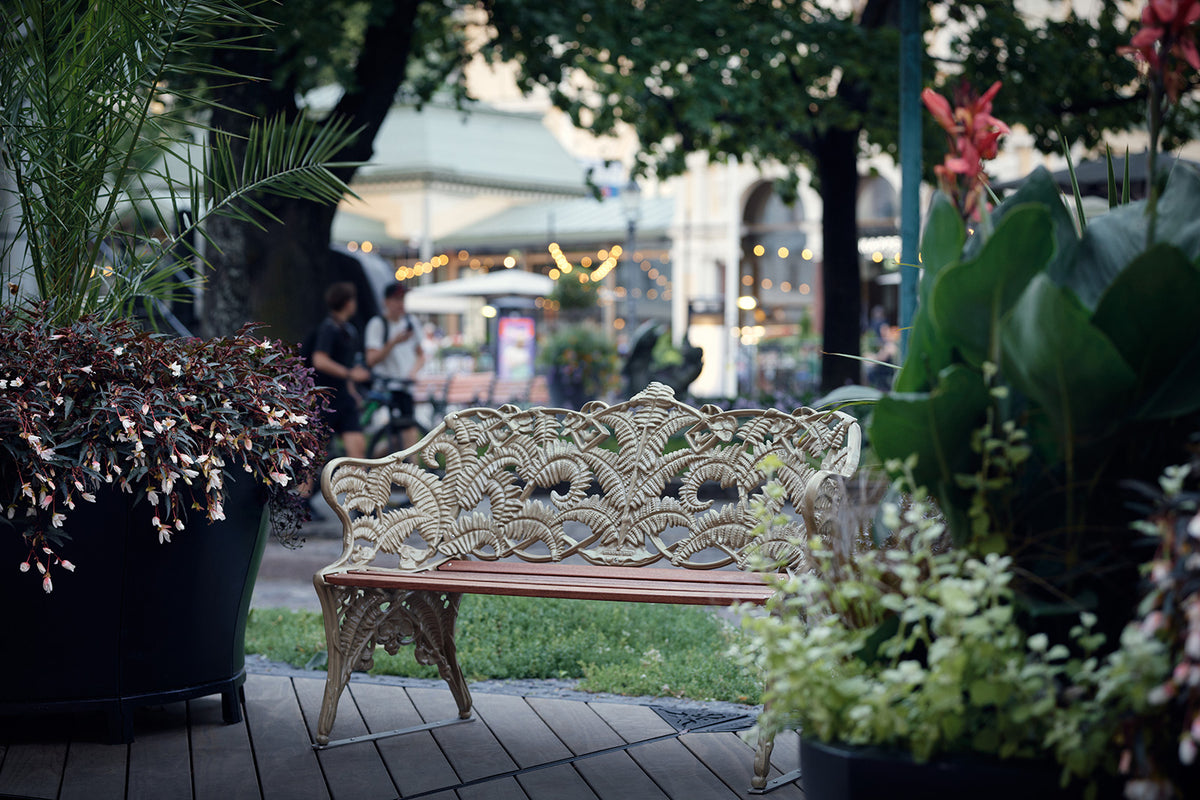 ”Byarums Bruks produkter fanns med i vårt inspirationsunderlag, och bland annat soffa och bänk Jujolvar tydliga favoriter”, berättar Pia Salmi. En annan produkt som väckte intresse var Classic, ”Ormbunkssoffan”, skapad vid samma tid som Esplanadparken och fortfarande i produktion hos Byarums Bruk. Soffan beställdes i ett exemplar, i guldfärg, och står nu som en spektakulär solitär på det nya området.