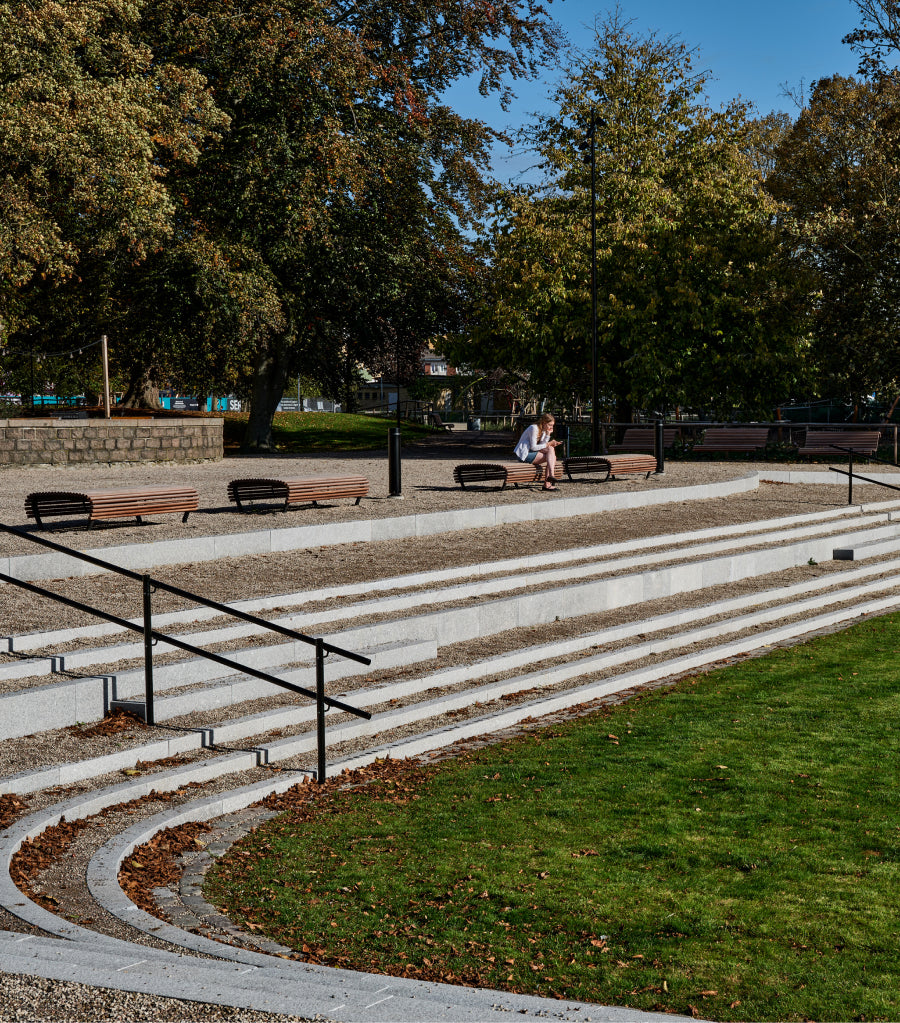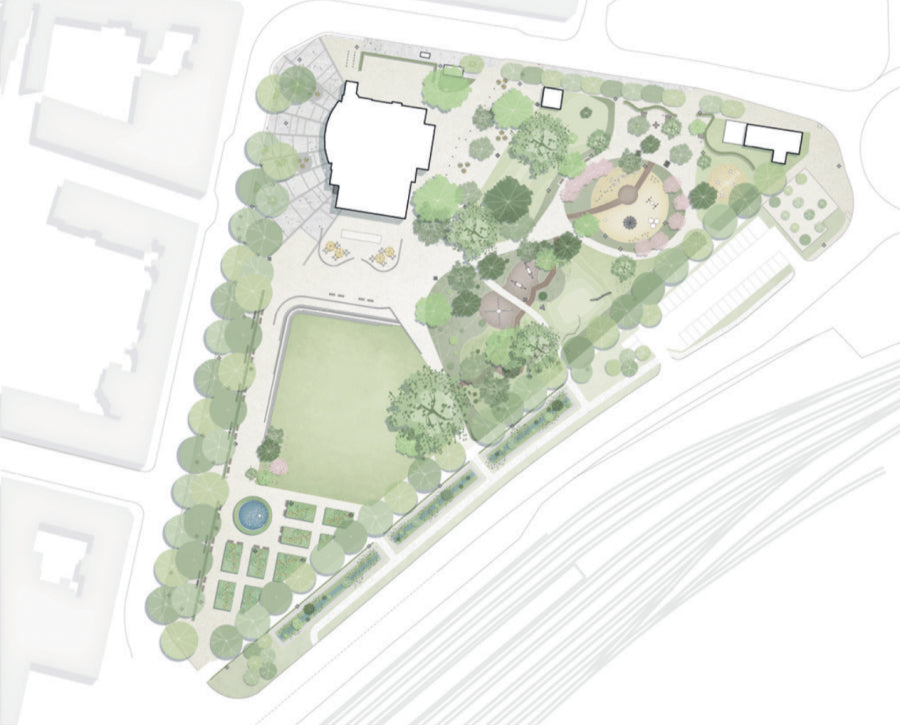 Parkens struktur har förtydligats med nya stråk, mer generösa platsbildningar och en bättre avgräns- ning mot omgivande trafikerade gator. Hänsyn till parkens status som fornminne och kravet på mer varierade planteringar i syfte att gynna pollinering har också tagits i beaktning.