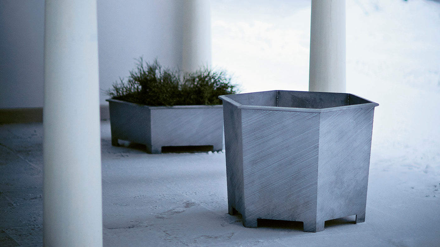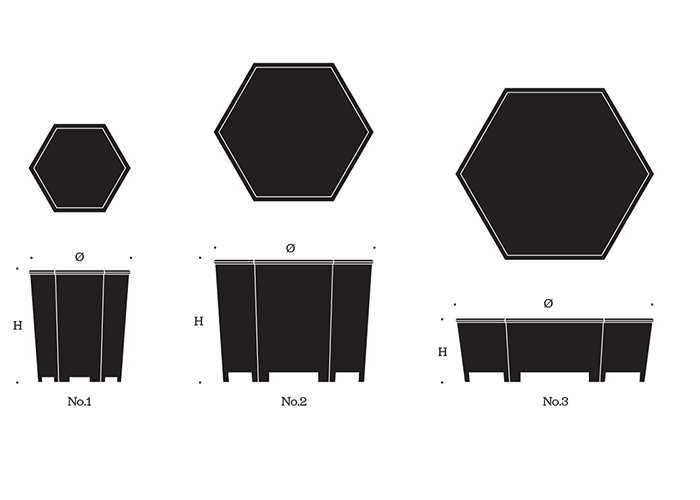 Sexkanten är en spännande form, här ytterligare betonad av den streckdekor Signe Persson-Melin lagt direkt i formen. Trots stramheten i de tre pjäserna känner man tydligt hantverket bakom. För enklare underhåll kan Hexagon 2 och 3 kompletteras med tillhörande planteringsinsats och bevattningstank.