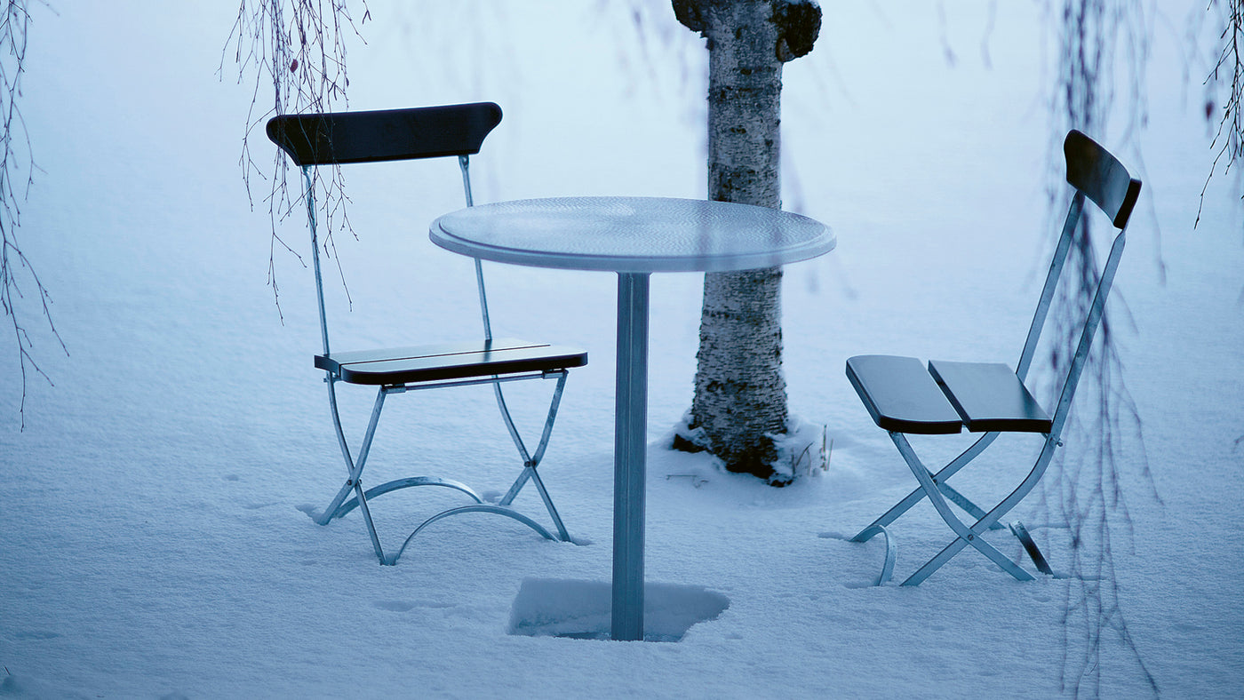 Grafiskt bord där foten gjuts i två olika storlekar, liten respektive stor. Valet av fot beror på underlag, bordsskivans utförande samt användningsområde. I standardutförande finns bordsskivor i gjuten aluminium, ribbat virke samt marmor, vilket ger en mängd av kombinationer att välja bland.